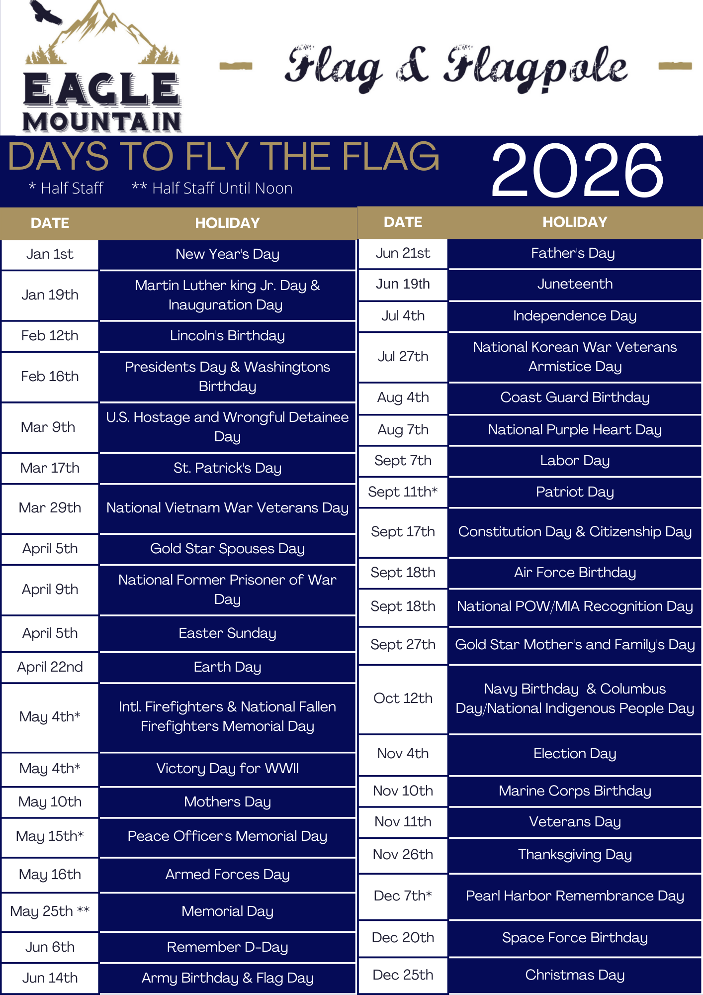 Concerned about missing a day or forgetting when to put the flag at half staff in 2026? Not to worry, we do the memorization for you! If you sign up to or email blast, we’ll send you reminders throughout the year, updates on executive half staff orders, and special offers, so you can just sit back and enjoy your beautiful flag.
